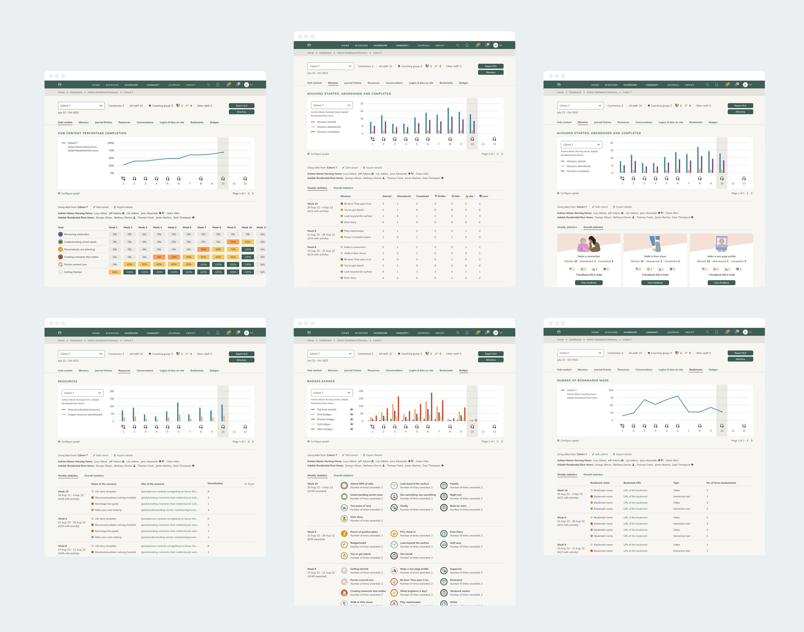 Following the development of the platform, the next piece of work focused on designing the Admin Dashboard, a central hub for monitoring engagement, training completion, and resource usage across the iWHELD platform. The aim was to give coaches a clear, data-driven view of how user were interacting with the training modules and keep track with each one of them. Each screen visualises key metrics through simple charts and structured tables, allowing quick comparisons and actionable insights. We designed the interface to feel calm, consistent with the branding, and easy to navigate, maintaining the same visual language established in the platform while adapting it for data-heavy content.